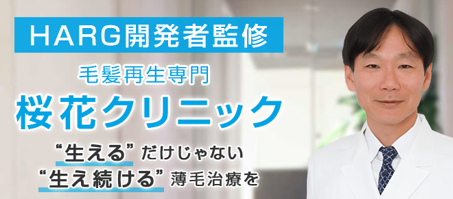 桜花クリニックでは、このHARG治療開発者である福岡医師のもと、専門の医師が診察の上、患者一人ひとりの症状や悩み、薄毛の特徴、体質を見極めて最適なオーダーメイドの治療を提供していきます。