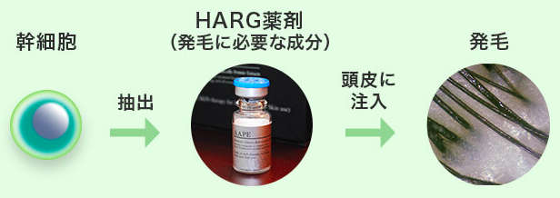 幹細胞から抽出したHARG(ハーグ)薬剤を患者の頭皮に直接注入し、発毛サイクルを整え、強く・太く髪の毛の発毛を促していきます。